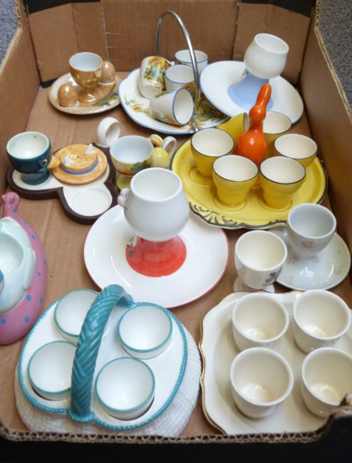 Collection of egg cruets including one kitsch example with figural duck handle, Royal Worcester majolica style etc, tallest 15cm
