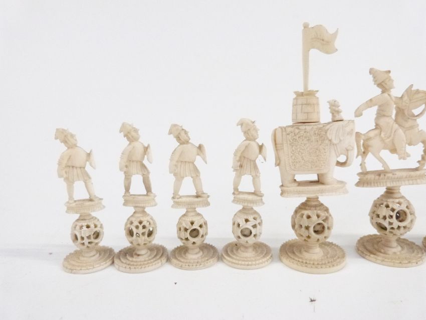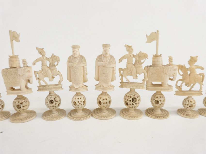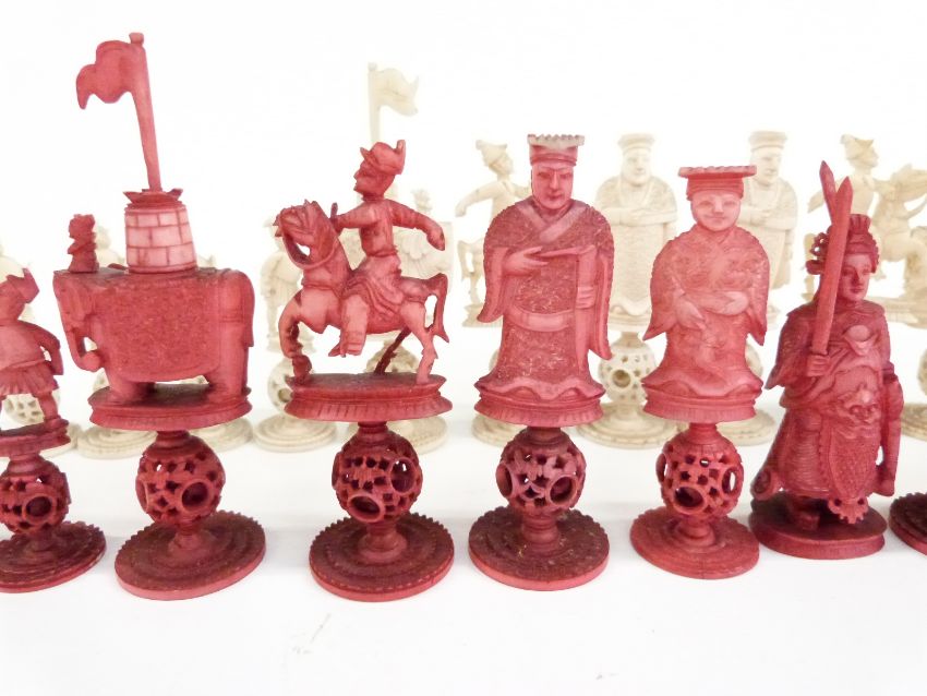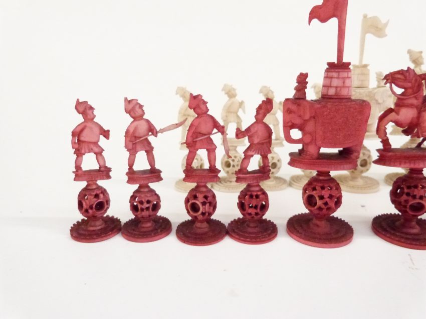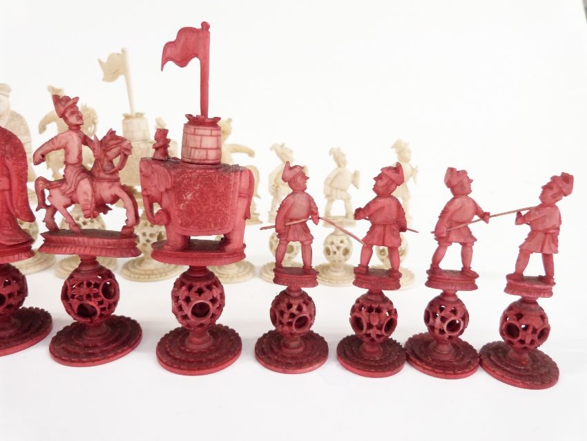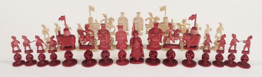 A 19thC/early 20thC Chinese carved ivory part puzzle ball chess set, one side stained red, height of tallest piece 11cm (30 pieces)