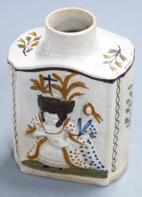 A late 18thC Prattware tea caddy with relief decoration of figures, probably King George III and Queen Caroline with attendants, H12.5cm