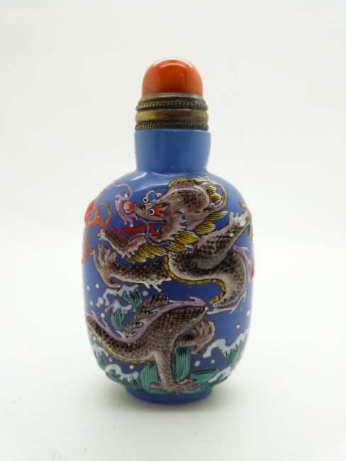 Chinese glass scent bottle with raised enamel dragon decoration, four character mark to base and coral stopper, 8cm tall
