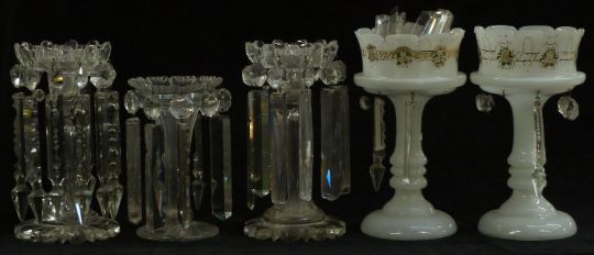 Two pairs of Victorian glass lustre vases, one pair opaline the other clear, together with another smaller example, largest 15cm tall