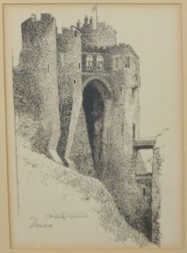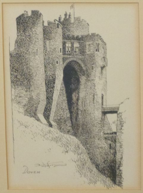 Frank Patterson (British 1871-1952): Two pen and ink drawings 'Durlston Bay, Dorset' and 'Dover' depicting the Castle, both signed, larger 20 x 23cm