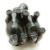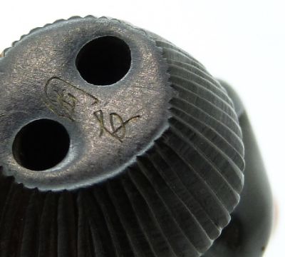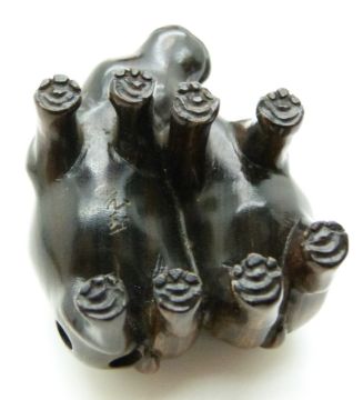 Japanese dark wood netsuke depicting a frog playing a musical instrument together with a Japanese dark wood netsuke depicting two hippopotami, both signed