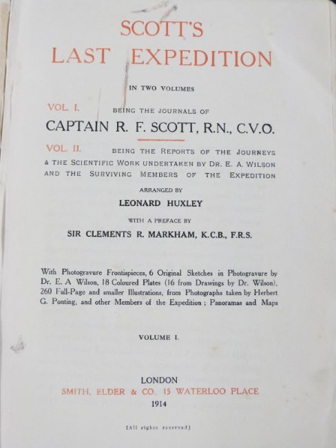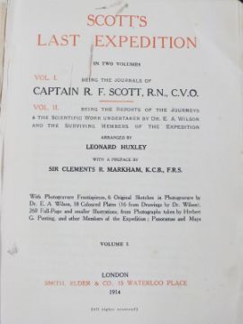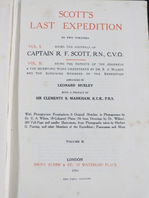 Scott's Last Expedition in two volumes, being The Journal of Captain R.F. Scott and The Reports of the Journeys & The Scientific Work undertaken by Dr. E.A. Wilson and the Surviving Members of the Expedition Arranged by Leonard Huxley with a preface by Sir Clements R. Markham with portraits, photogravures, colour plates and maps, published Smith Elder 1914 in 2 volumes in original gilt lettered cloth (2)