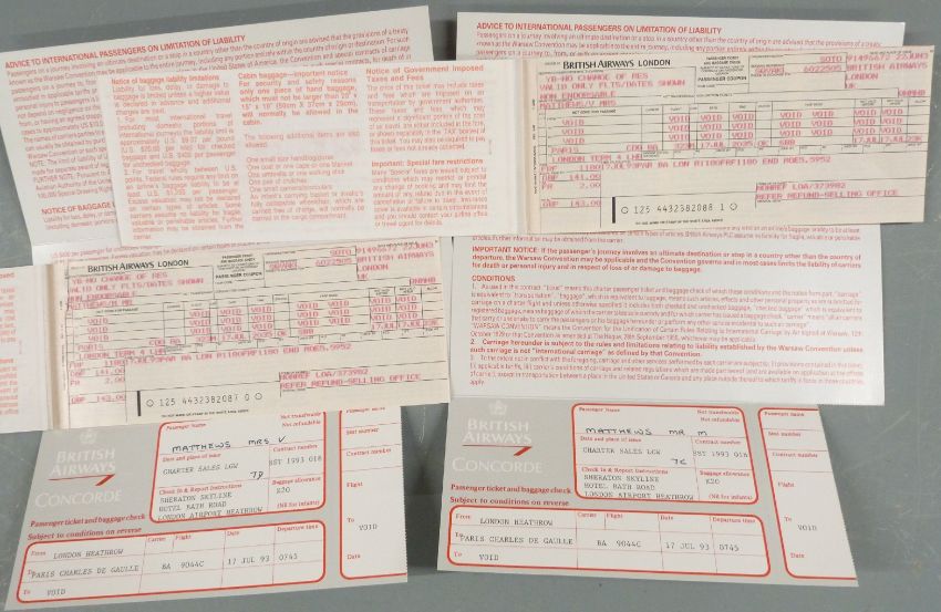 Quantity of Concorde ephemera including tickets for London to Paris in 1993, luggage tag etc