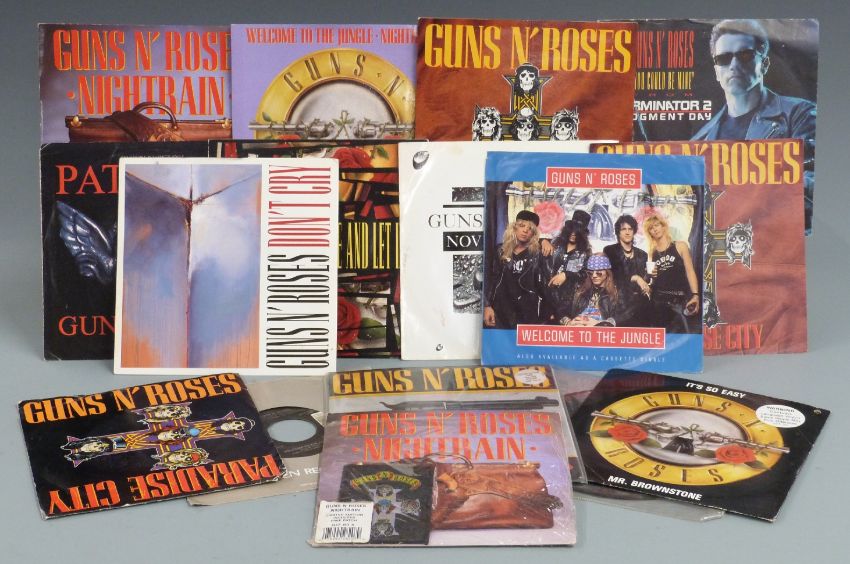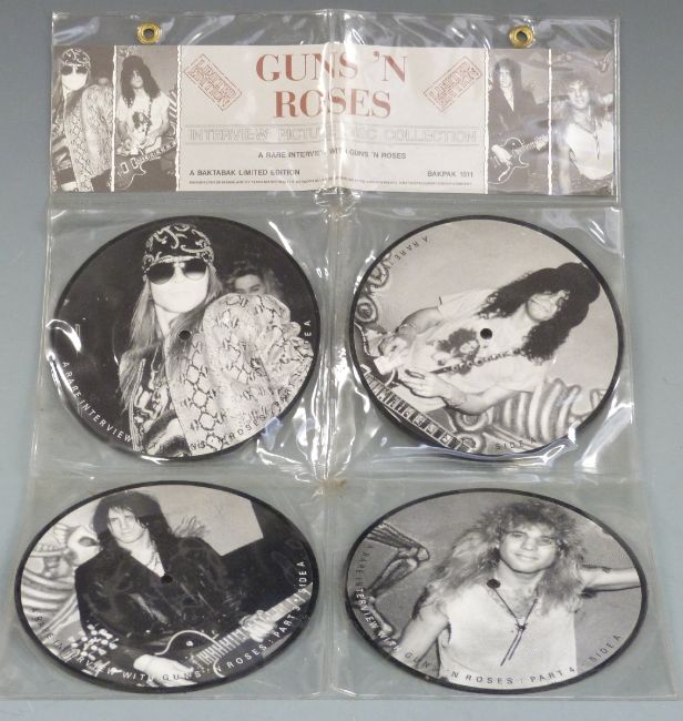 Guns N' Roses - 15 singles most in picture covers plus four picture disc interview pack (BAKPAK 1011) including Nightrain (GEF60) with patch, Sweet Child O' Mine (GEF 55X) with sticker, It's So Easy (GEF 22)