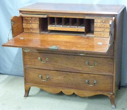 A 19thC mahogany secretaire with three straight graduated drawers, the secretaire with brass button mechanism for the fall flap, fitted interior with drawers and cubbyholes and shaped apron, raised on bracket feet, W111 x D55 x H106cm