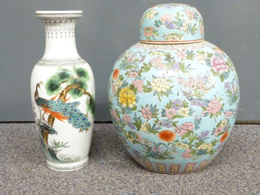 A 20thC Chinese ginger jar decorated with flowers on aqua ground, 31cm tall and a Chinese republic period style vase with peacock decoration and seal mark to base, 31cm tall