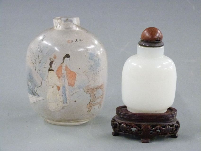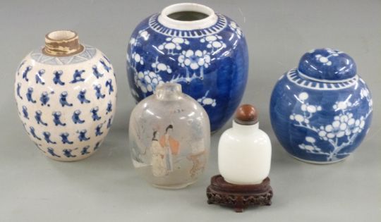 Three Chinese ginger jars, one with six character mark to base, a reverse painted glass scent bottle and a glass snuff bottle with sunstone stopper and hardwood stand