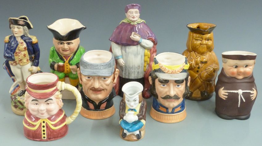 Nine Toby character jugs etc including musical, large 19thC example, Nelson, Cardinal etc