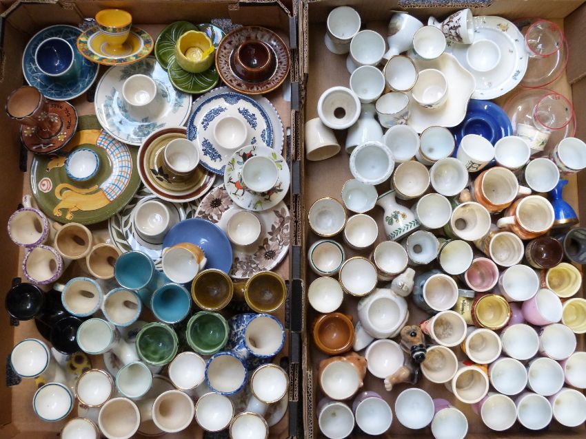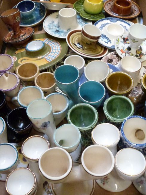 Approximately 130 novelty egg cups including twin branch, saucers, glass, Torquay ware etc