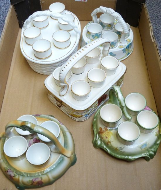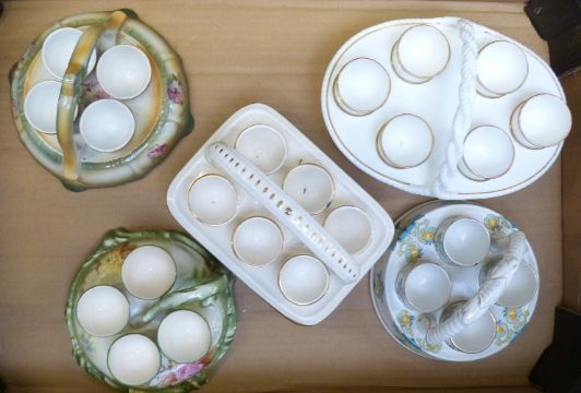 Five egg cruets including Burleigh and porcelain examples probably Spode / Minton, tallest 12cm