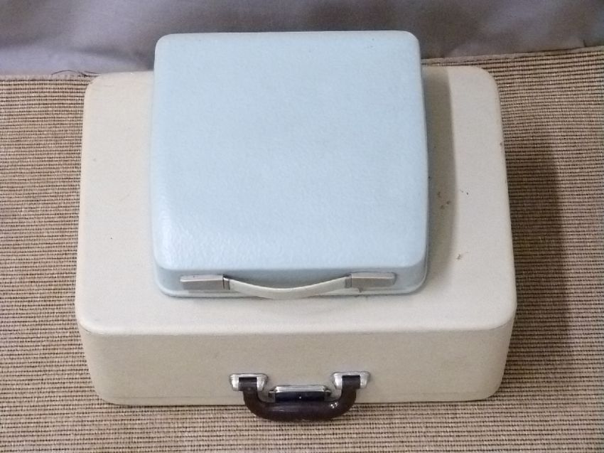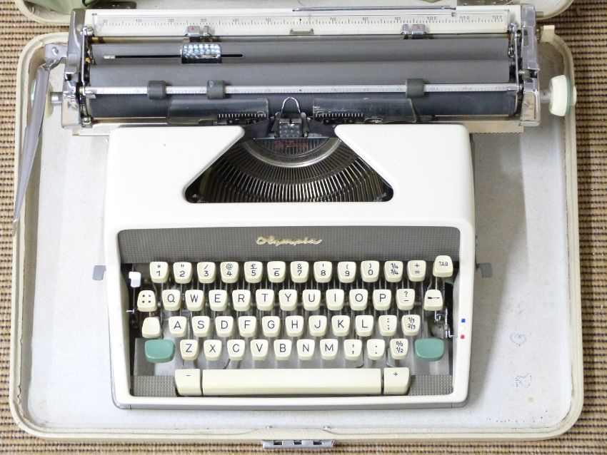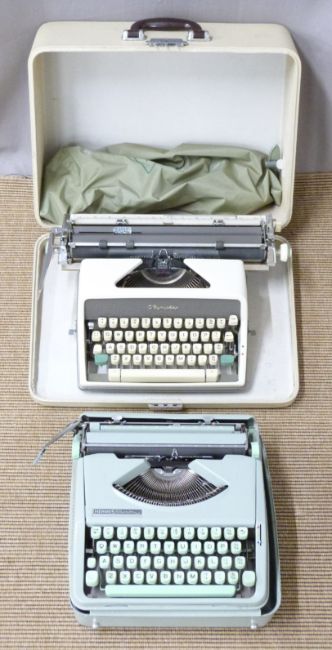 1950s retro / mid century Hermes Baby portable typewriter and an Olympic de Luxe typewriter in case with dust cover