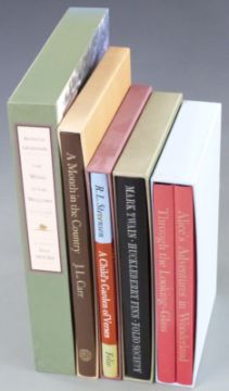 Lewis Carroll Alice’s Adventures in Wonderland and Through The Looking Glass illustrated John Tenniel in 2 volumes Folio Society, Kenneth Grahame The Wind in The Willows in 2 volumes illustrated by Inga Moore, Mark Twain Huckleberry Finn with wood engravings by Harry Brockway, A Child’s Garden of Verses by Robert Louis Stevenson illustrated, A Month in the Country by J.L. Carr – all in slipcases