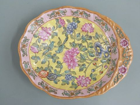A 20thC Chinese enamelled pedestal dish decorated with chrysanthemums and birds, with four character mark to base, 24cm x 19.5cm