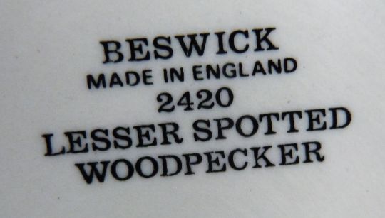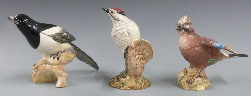 Three Beswick birds comprising magpie, jay and woodpecker, tallest 14cm