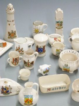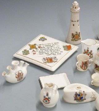A collection of crested ware including Goss teapot stand