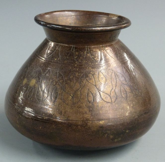 19thC or earlier Japanese bronze vase with engraved decoration, H12cm