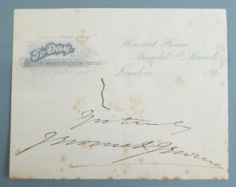 Signed / autographed Jerome K Jerome clipped headed notepaper from 'Today' weekly magazine journal, which was edited by Jerome, 11 x 13cm, together with a postcard of Jerome