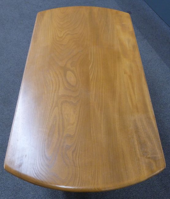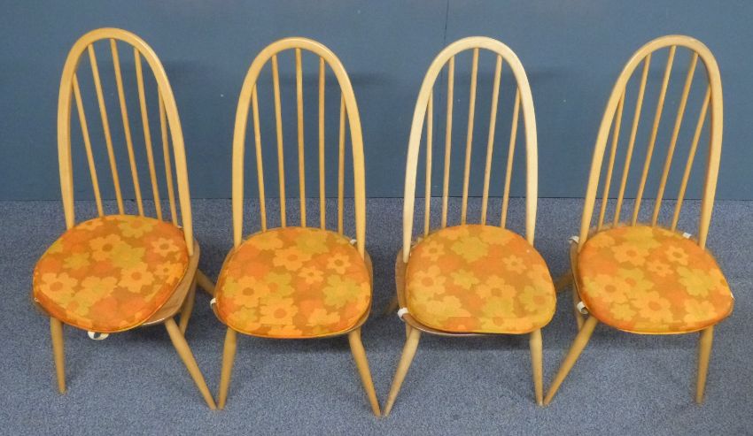 Ercol mid century / modern retro light elm table and four hoop backed chairs with 1970's cushions, W112 x D125 x H72cm