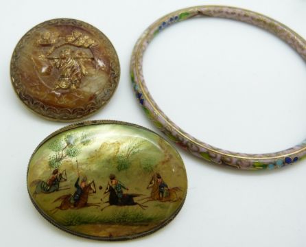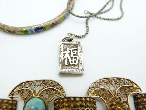 A carved Chinese brooch, cloisonné bangle, Indian brooch, Japanese bracelet, Chinese silver pendant, filigree bracelet, etc