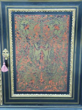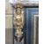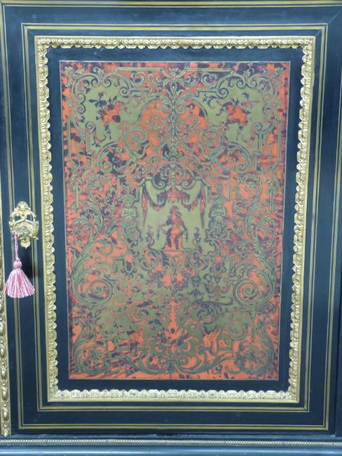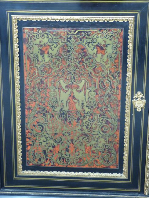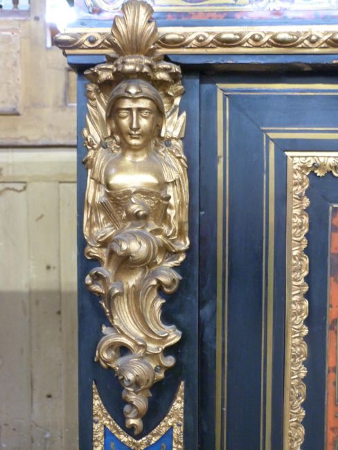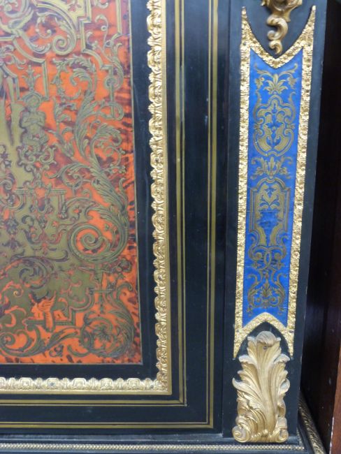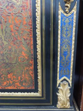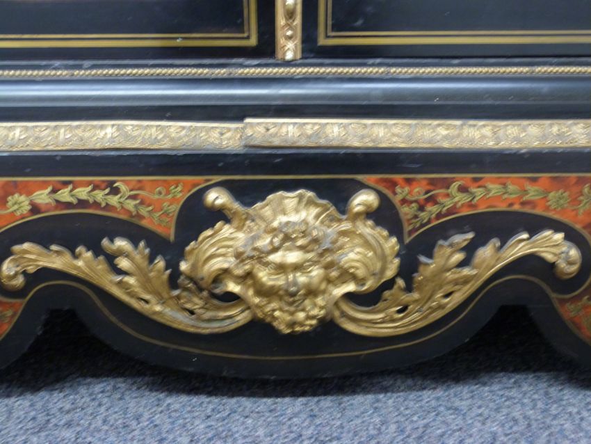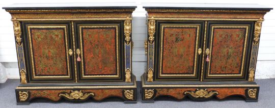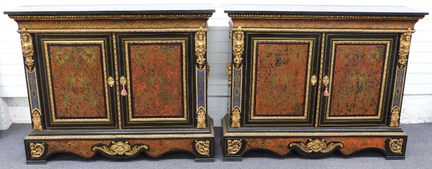 A pair of 19thC French boulle cabinets with marble tops, figural mask and decorative ormolu to the fronts and sides, unusual blue boulle work panels and shaped aprons with mask decoration. The interior mahogany veneered with inlaid adjustable shelves, W148 x D42 x H120cm