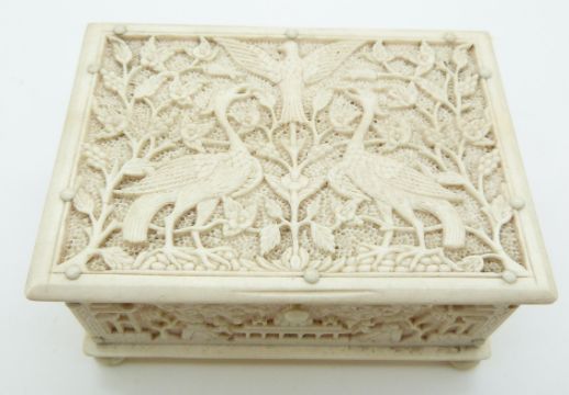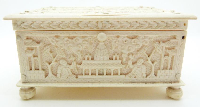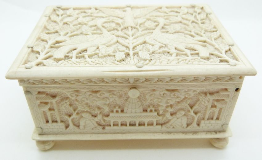 A late 19thC / early 20thC Chinese carved ivory box depicting birds, and men with tools, raised on bun feet, W12 x D8.5 x H6cm
