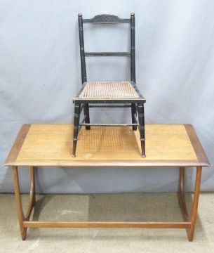 A mid century G Plan style coffee table and a child's bergère chair, the table W99 x D50 x H53cm
