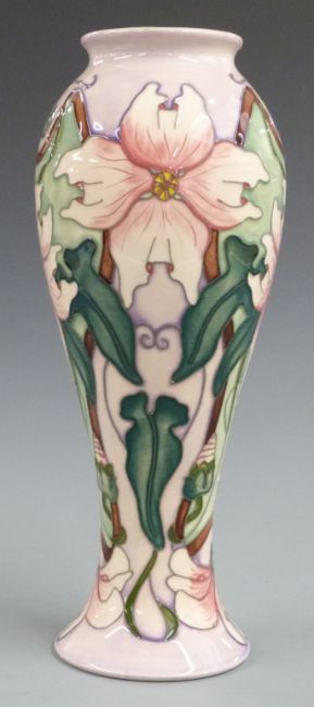 Moorcroft pedestal vase decorated with pink flowers, dated 2001 to base, H27cm
