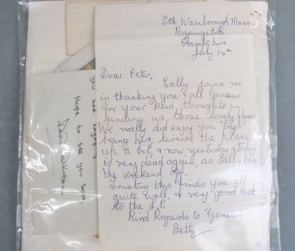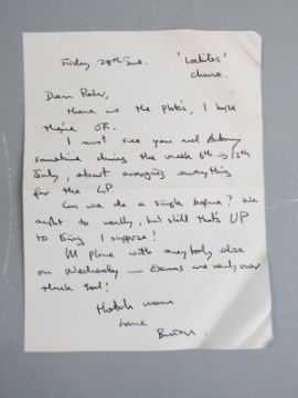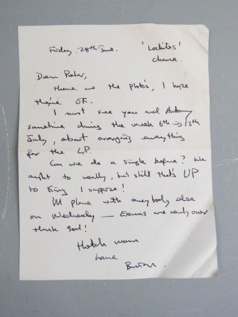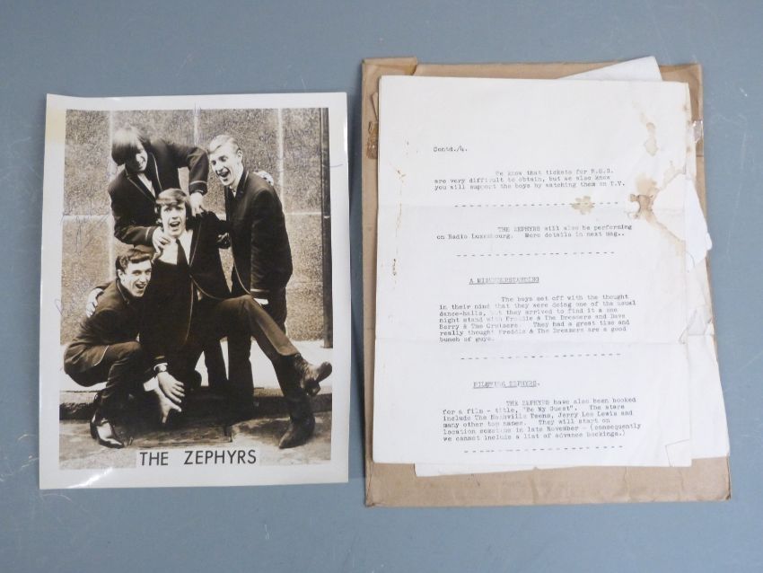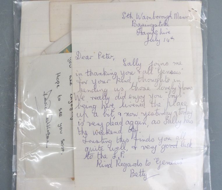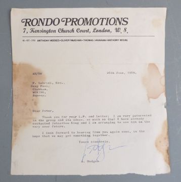 A large quantity of Peter Gabriel ephemera, relating to his early years from Charterhouse School through to his band Milords (M'Lords) and Genesis. In the collection are early letters and documents regarding attempts to promote and obtain agency along with a rejection letter to play in Portugal, a letter from Jonjo Music Ltd dated 3rd May 1968 and a letter regarding the playing of 'The Silent Sun' on Radio Caroline and not on Radio One. Early promotional photographs of the band, press release document by Charisma Records, Genesis date sheets for April to August c1969 with fees paid,  handwritten embryonic lyrics for 'She is Beautiful' from 1967 with the original title 'Photographic Model', another for 'Fireside Song' with chords on the reverse and some other unknown lyrics. The school house list for January 1965 includes the names of Peter Gabriel, Mike Rutherford and Tony Banks. In addition the lot includes fan club items and signed photo for The Zephyrs, (Peter Gabriel was a member of the fan club whilst a student at Charterhouse), and further letters and papers too numerous to mention.