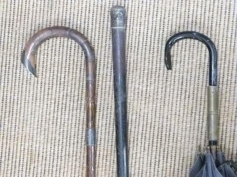 19thC/20thC stick stand with two hallmarked silver mounted sticks and an umbrella