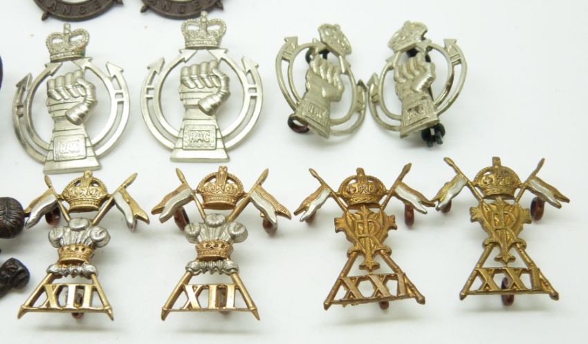 Fourteen British Army 12th, 21st, and 24th Lancers, Royal Wiltshire Yeomanry and Royal Armoured Corps metal collar badges, all in pairs