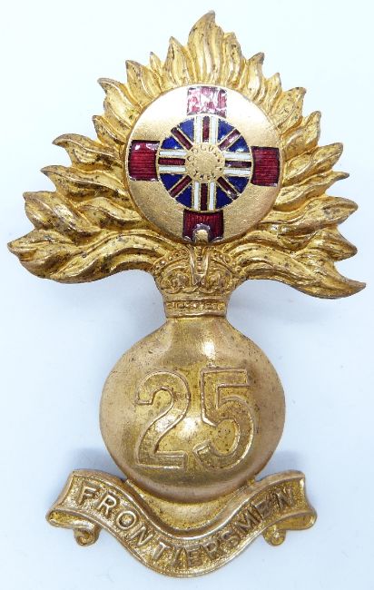 British Army Fusiliers 25th Service Battalion (Frontiersman) officer's gilt and enamel cap badge