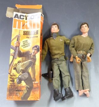 Two Palitoy Action Man Soldier figures, one in original box together with various outfits and accessories.