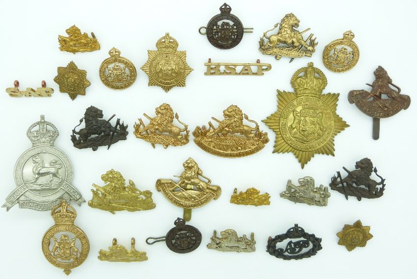 Collection of South Africa Police and British South Africa Police metal badges including two by Firmin