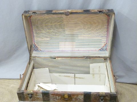 Ash and metal bound dome topped travelling trunk together, width 82cm with an animal skin rug