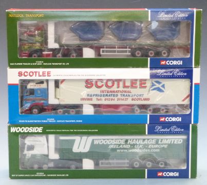 Three Corgi 1:50 scale limited edition diecast model lorries Matlock Transport Co Ltd CC12013, Scotlee Transport CC12420 and Woodside Haulage CC13214, all in original display boxes.