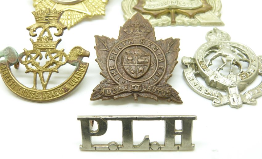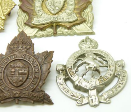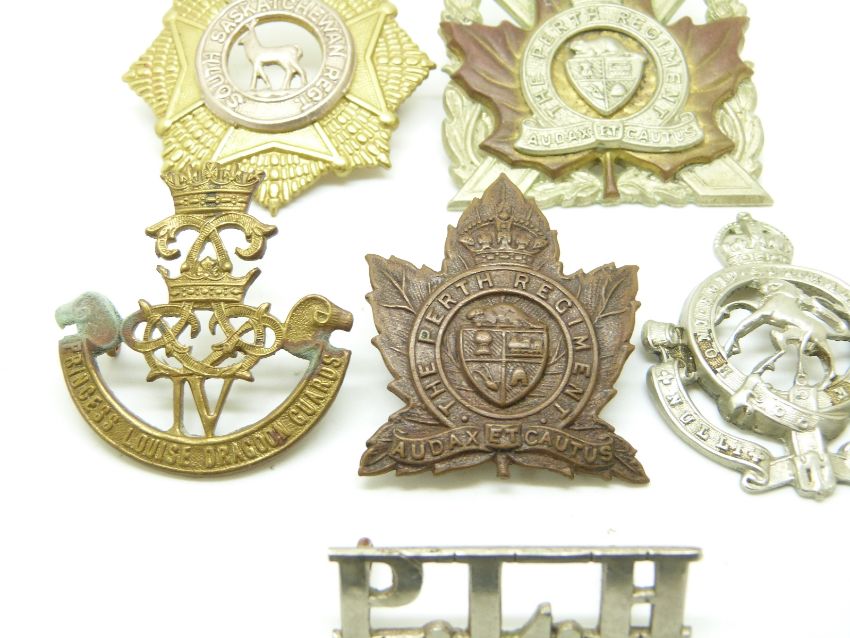 Five Canadian Army Perth Regiment, South Saskatchewan Regiment, Princess Louise Dragoon Guards and Governor General's Regiment metal badges together with a Princess Louise Horse shoulder title, Scully Ltd Montreal to reverse of larger Perth Regiment badge