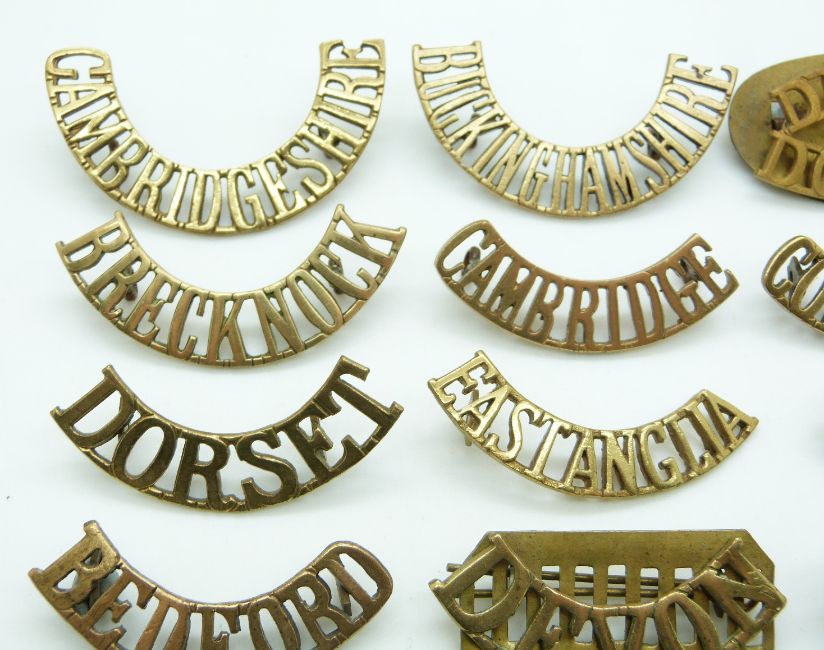 Eighteen British Army County Regiments metal shoulder titles including those for the Bedford Regiment, Brecknock Regiment, Cheshire Regiment, Derby Regiment and East Anglia Regiment etc