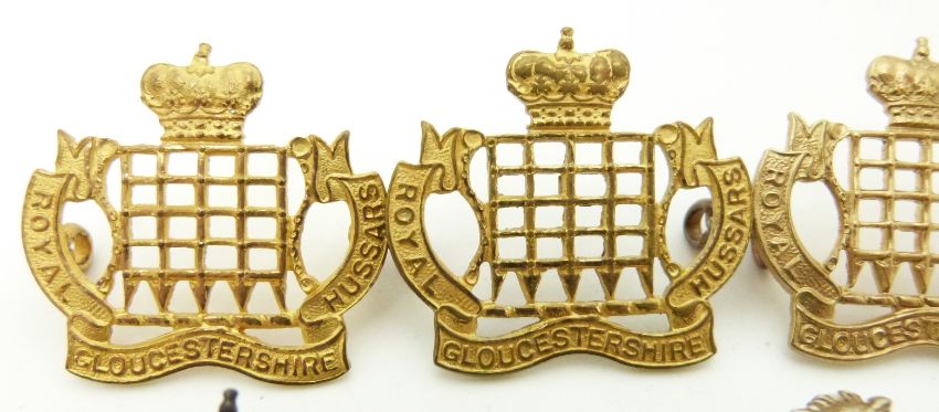 Fifteen British Army Yeomanry, Royal Gloucestershire Hussars, Warwickshire Yeomanry and Northamptonshire Yeomanry metal collar badges in seven pairs plus one