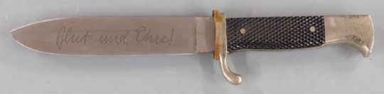 Nazi German Hitler Youth dagger with inset enamel badge to handle, 'Blat und Ehre' motto and RZM M7/36 to 14cm blade