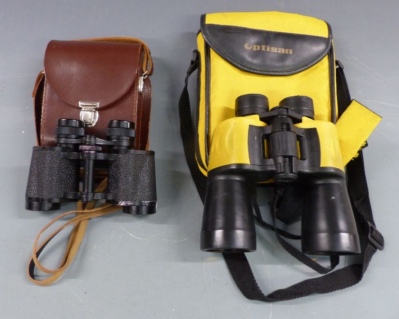 A pair of Carl Zeiss Jena Deltrintem 8x30 binoculars, in leather case, together with a pair of Optisan 7x50 Watersport binoculars