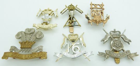 Six British Army Lancer Regiments metal and anodised badges including 27th Lancers, 16th Lancers, 21st Lancers (copy) etc, one by Gaunt