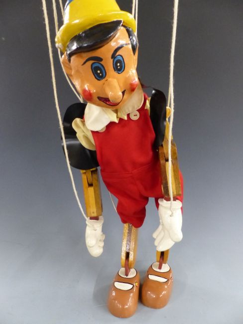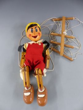 A large painted wooden Pinocchio puppet, possibly ex shop display, 56cm tall.