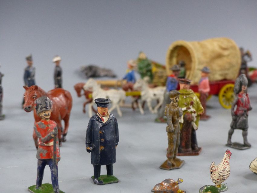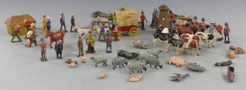 A collection of Britains and similar lead model farm animals, soldiers and accessories.