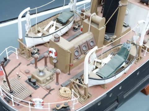Mountfield Models kit-built radio control model coaster / boat with sound and smoke generators and detailed wheelhouse interior, lifeboats, rigging, crew etc, 127cm long, on display stand.