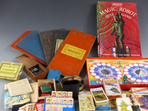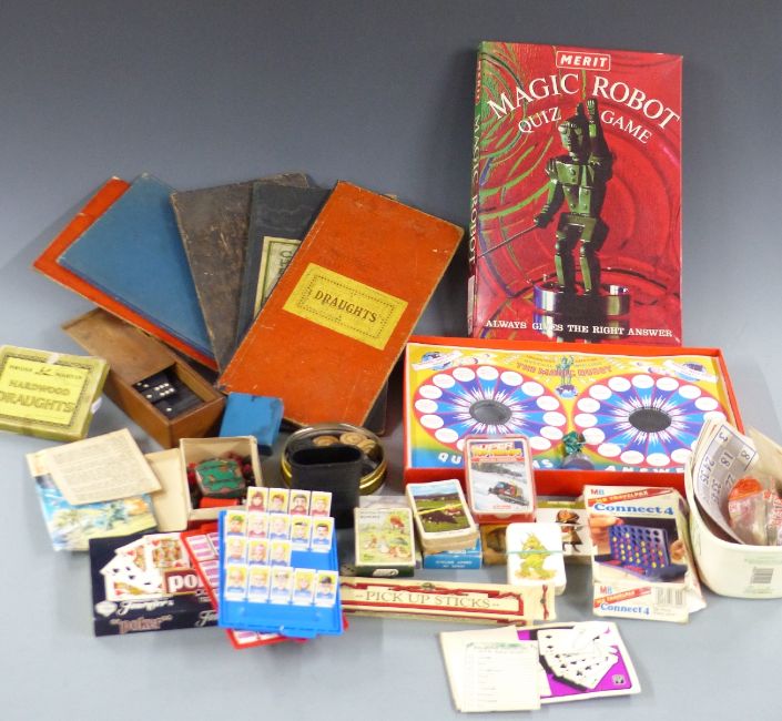 A quantity of vintage toys and games including draughts/chess boards, playing cards, draughts in wooden box, Merit Magic Robot Quiz game etc.