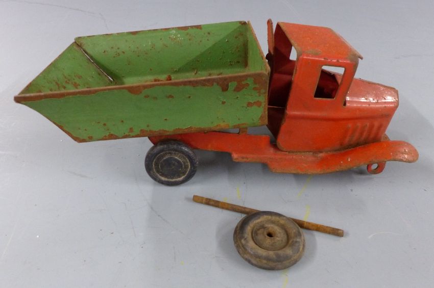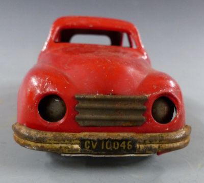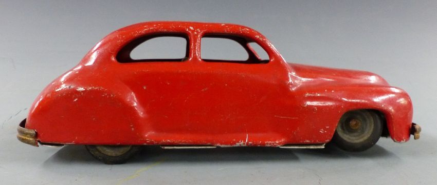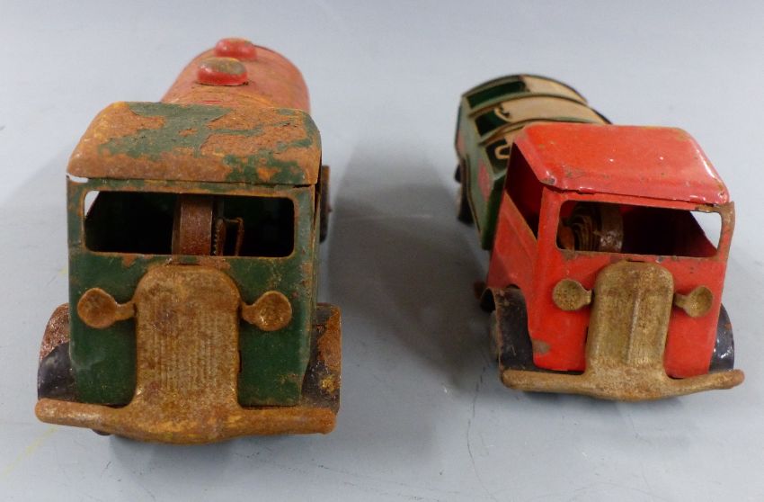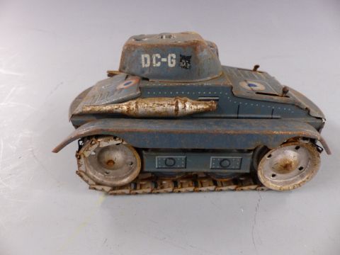 Six tinplate toys comprising Mettoy Playthings tractor, Chad Valley Harbourne car, two Tri-ang Minic lorries, a tank and a tipper lorry.