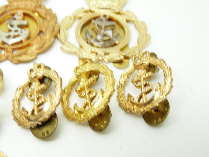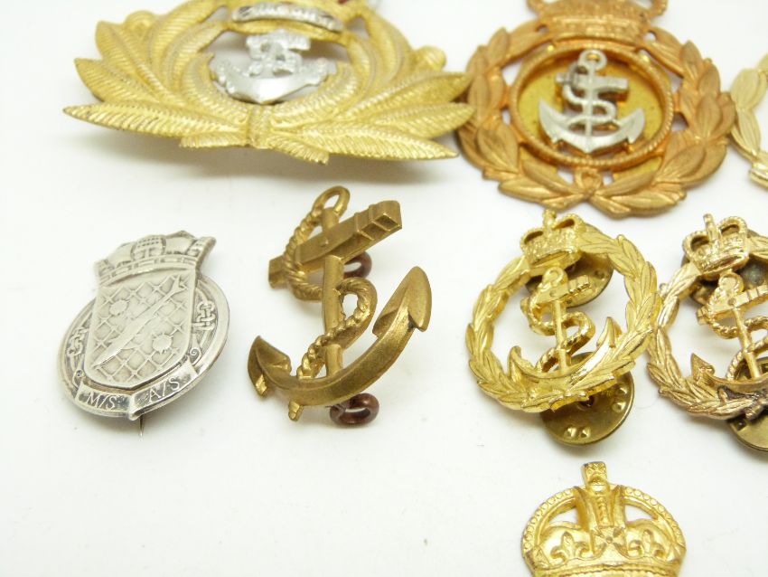 Ten Royal Navy metal badges including a small white metal mine sweeper example