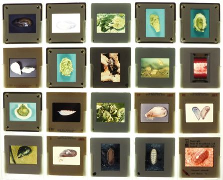 Quantity of cased Flatters & Garnett Ltd Manchester educational glass slides, of scientific and biological interest, together with a folder of similar interest slides